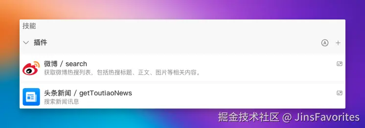 根据我们设定的人设,首先我们需要添加两个获取新闻信息的插件以此为用户信息获取的冷启动,这里我选用了扣子官方提供的两个插件,具体如下