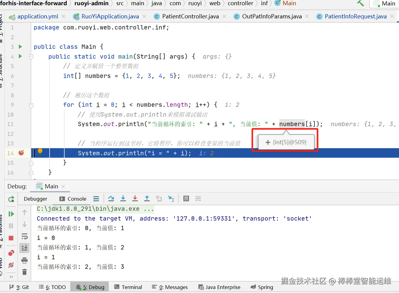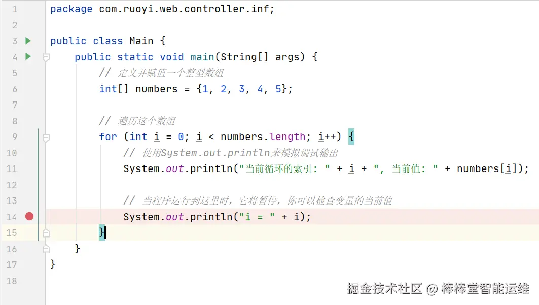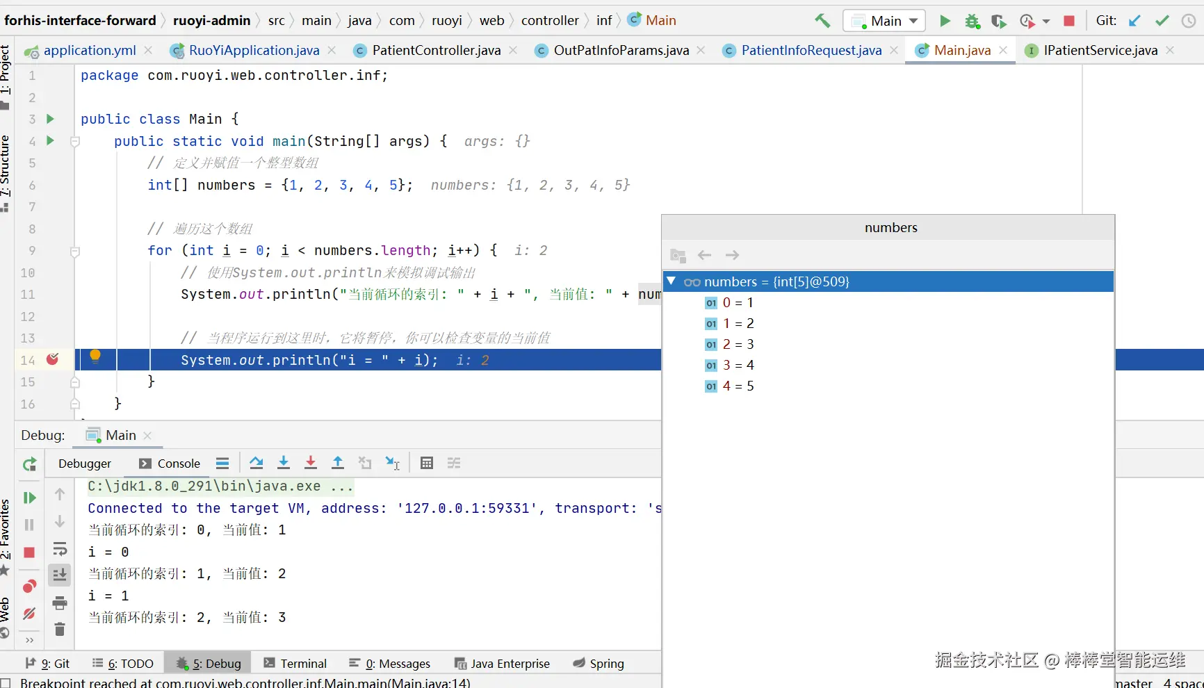 System.out.println("当前循环的索引: " + i + ", 当前值: " + numbers[i]);