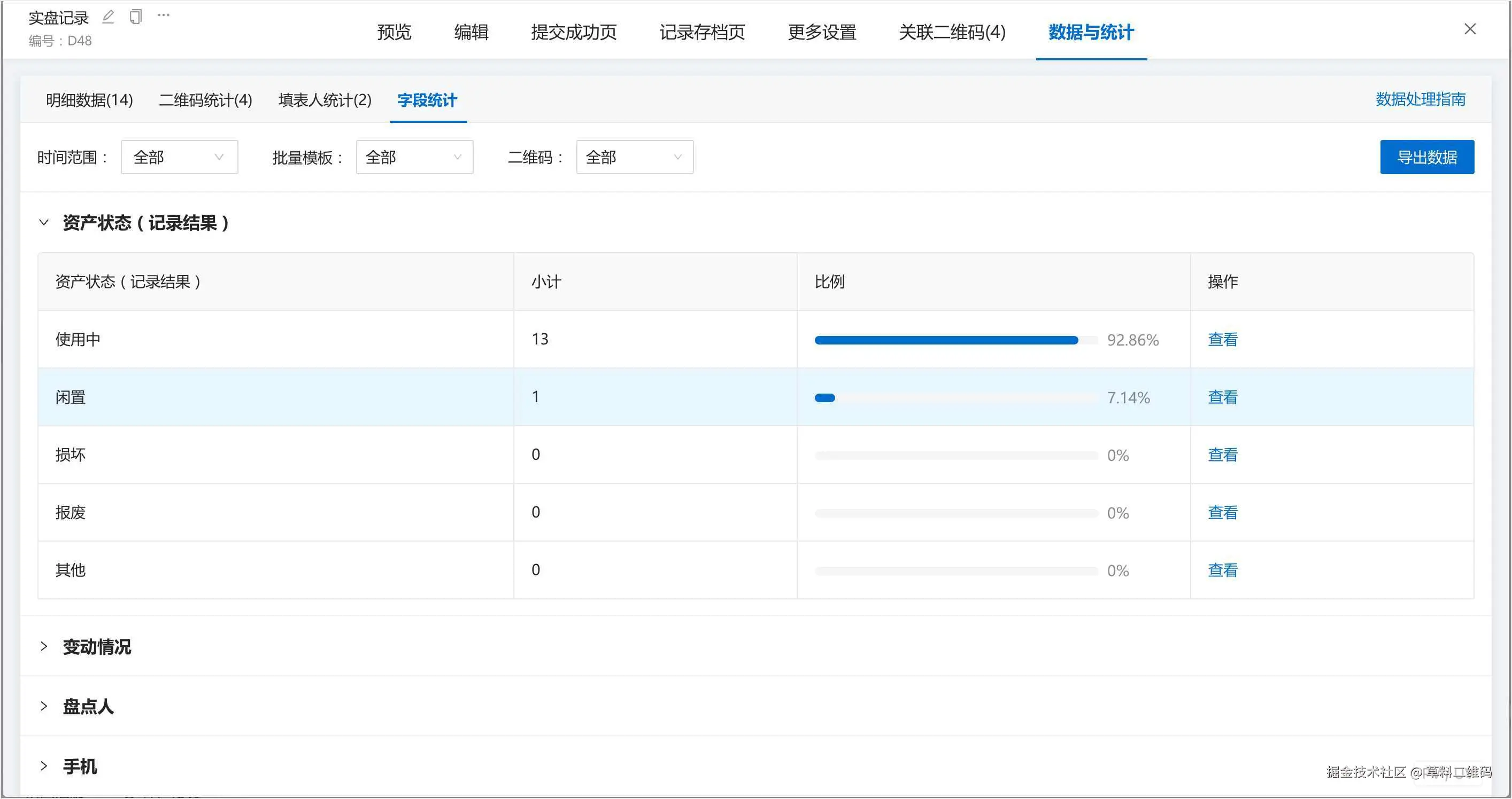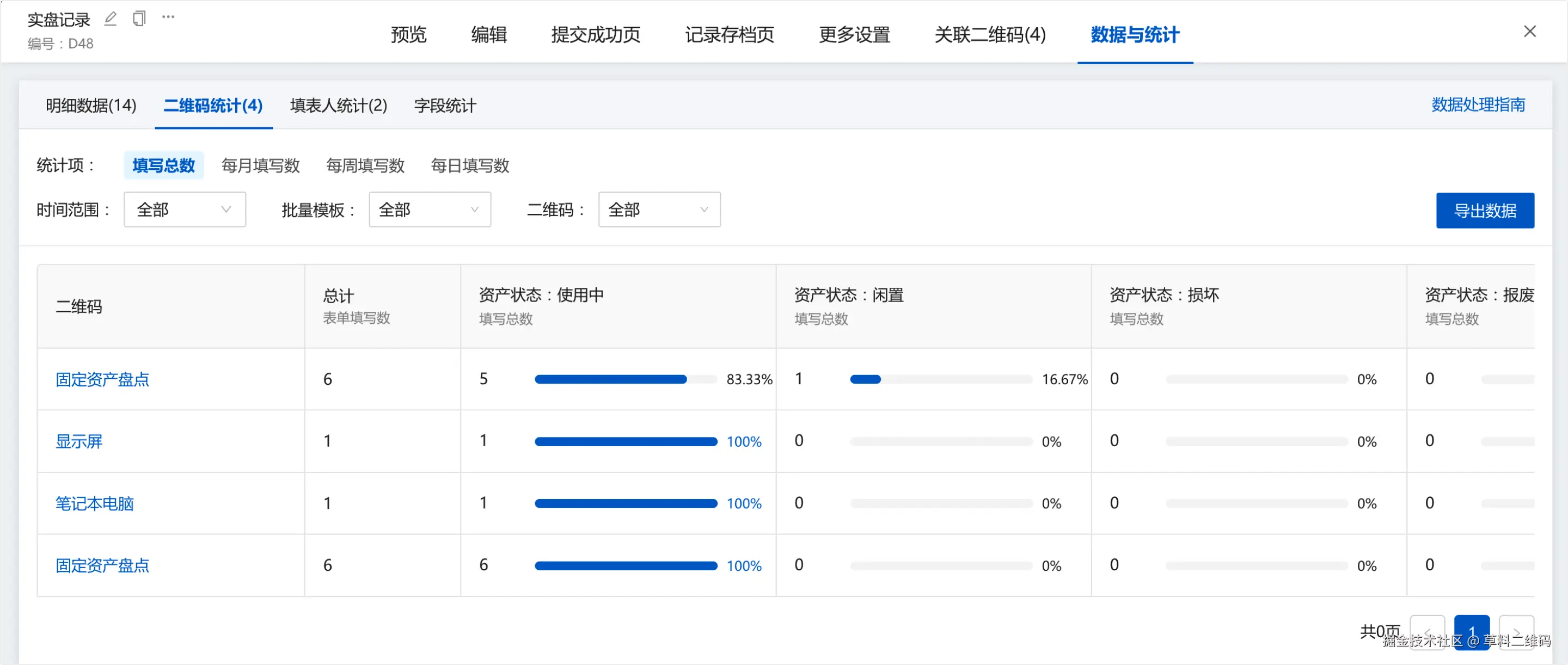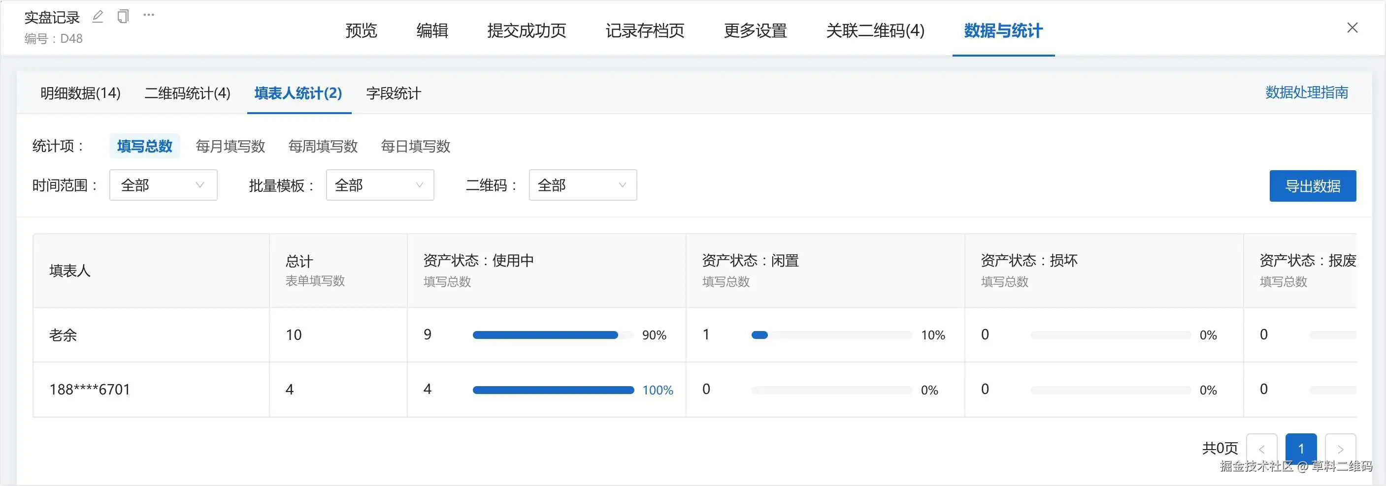 统计该表单所有表单组件字段的统计数据。可根据时间范围、关联的批量模板、关联的二维码进行筛选查看。