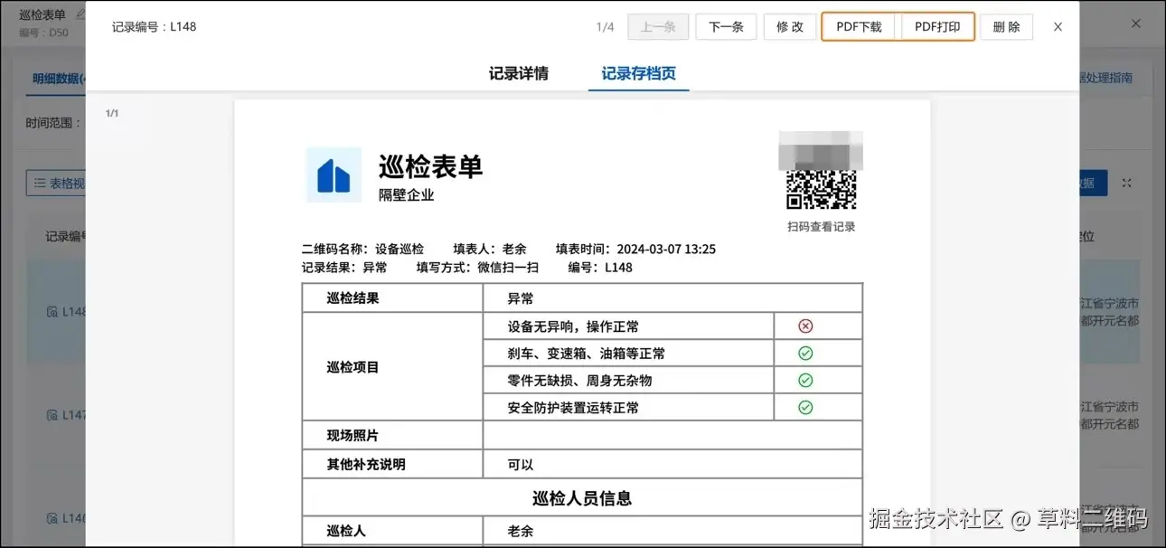点击具体单条数据,可查看记录详情和该条记录的记录存档页,支持单条记录的 PDF 下载和打印。