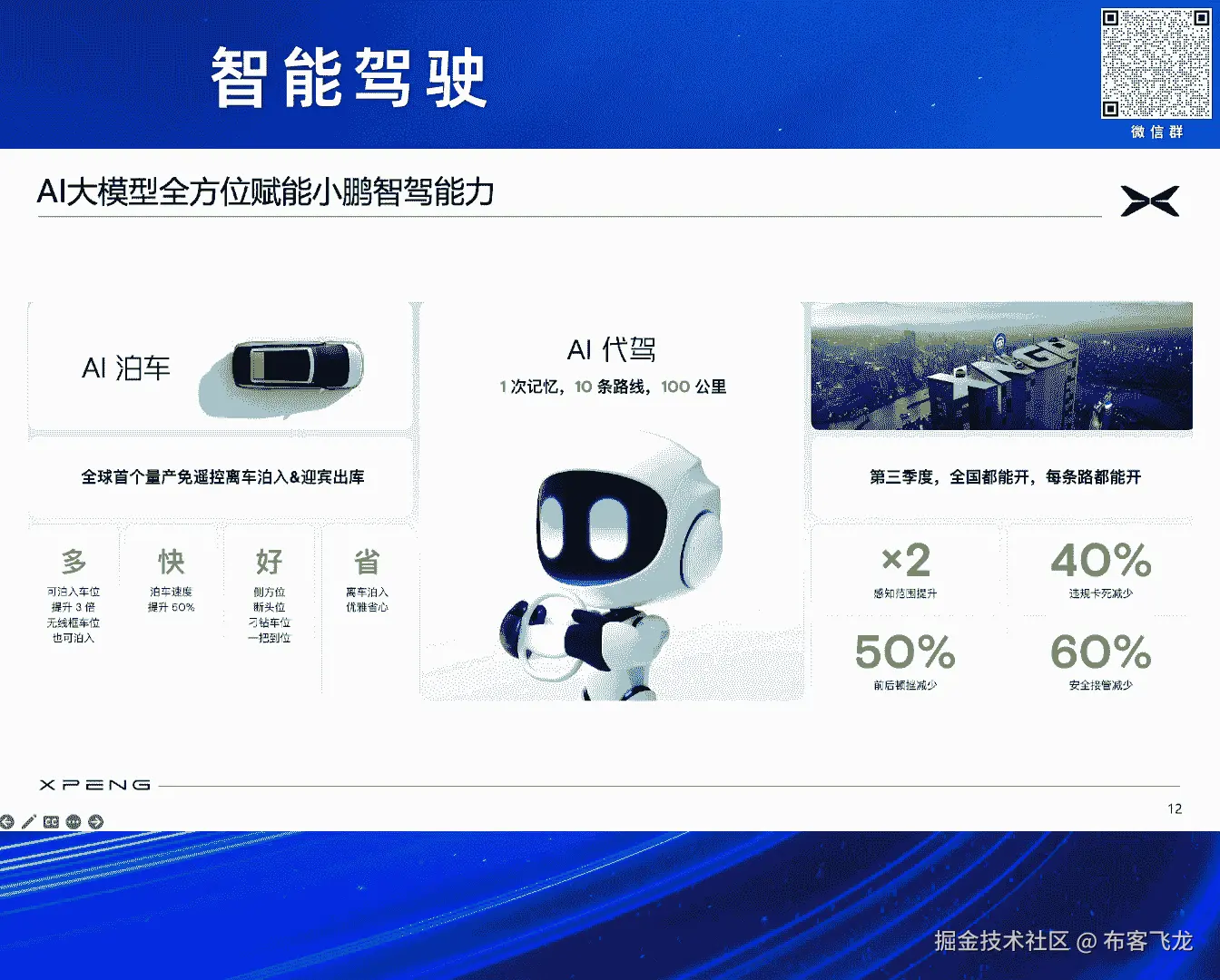 然后除了刚才提到的我们的行车之外,AI大模型其实现在全方位赋能,我们赋能我们小鹏的其他一些支架能力,比如说我们的AI泊车,我们现在也是做了全球首个量产的,离车薄入和迎宾出库。