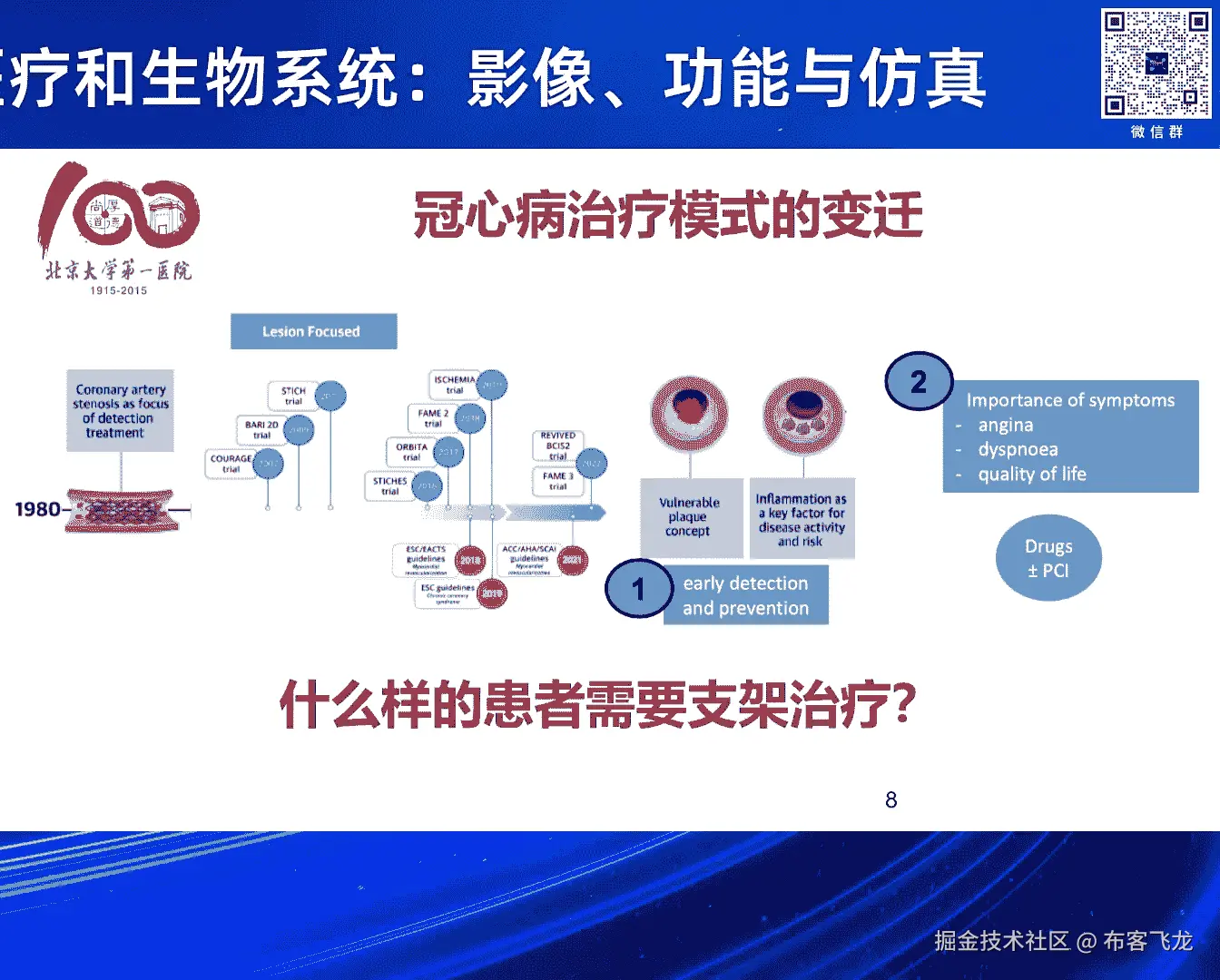 给他干预的准确,那提到了干预,那么大家都知道哈,这个冠心病的从治疗模式上,治疗手段大家都知道哈,我们有药物治疗是基础,那么接下来的治疗呢就是这个介入治疗哈,介入治疗是个微创的手术,那跟几十年相比。
