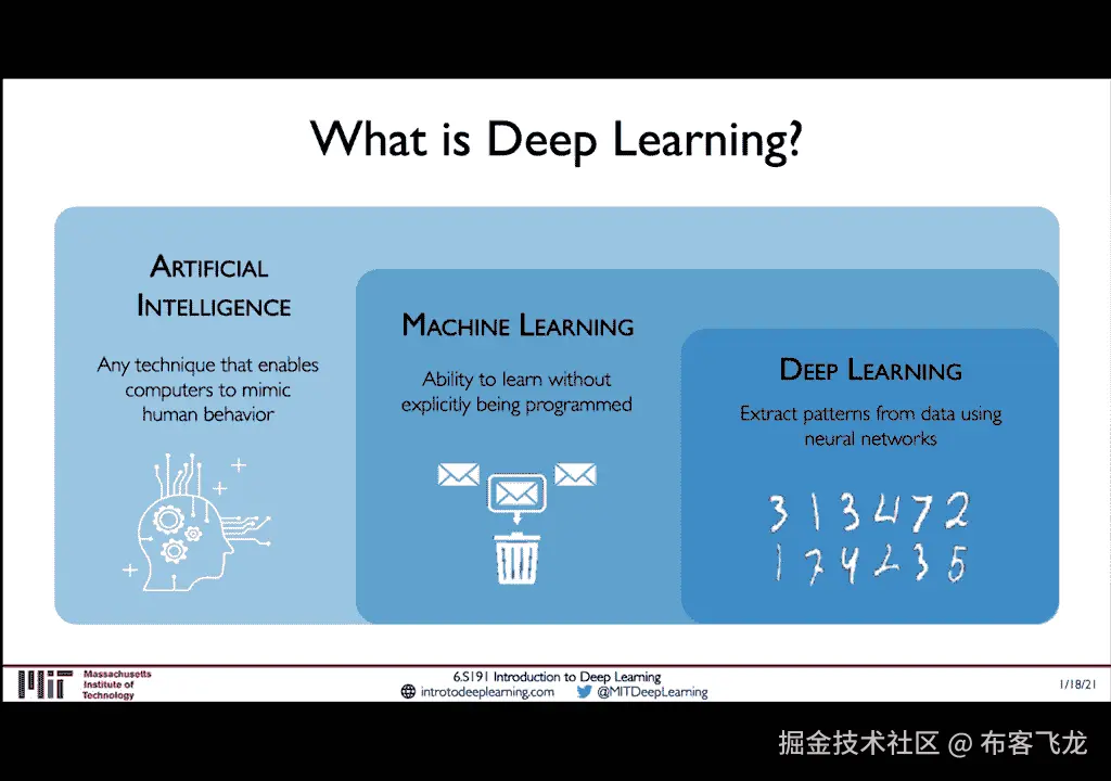 它是机器学习的一个子集,专注于使用神经网络,自动提取原始数据中的有用模式,然后使用这些模式或特征来学习执行这项任务,这正是这门课的内容,这门课是关于教授算法的,如何直接从原始数据中学习任务。