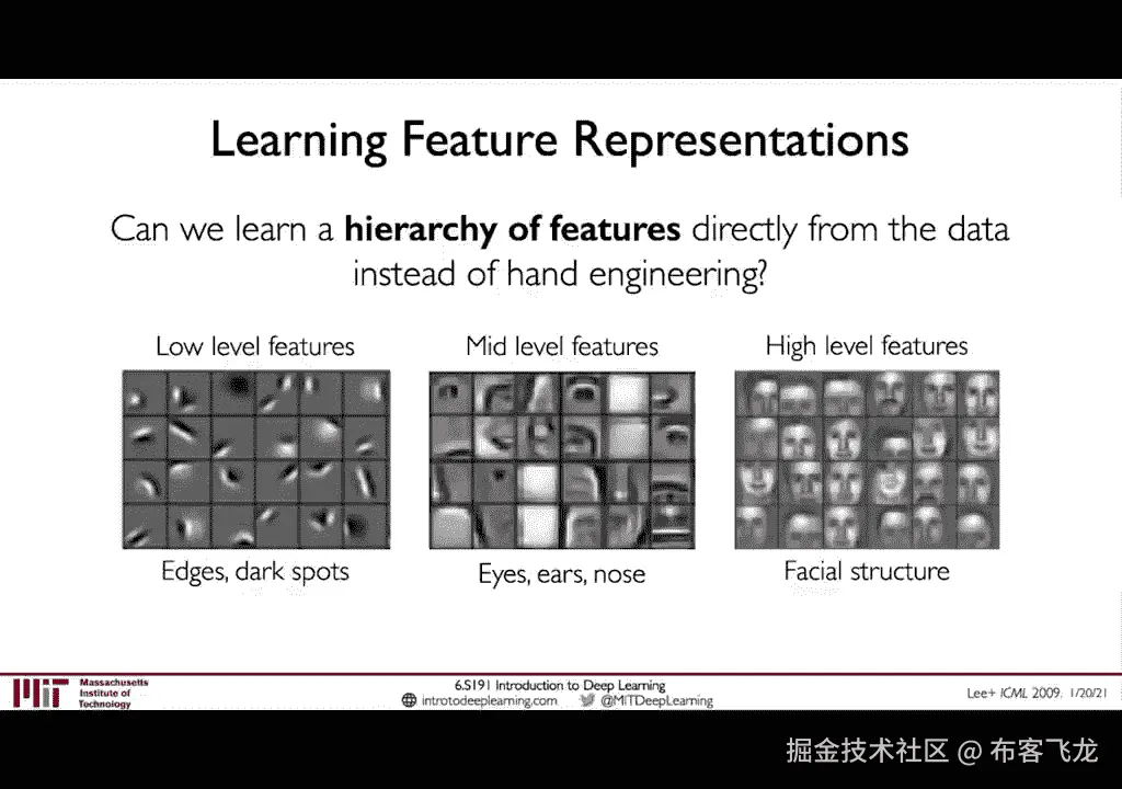 它们在实践中往往很脆,当他们被部署时,深度学习的关键思想是直接从数据中学习这些特征,以等级的方式,那就是我们能不能学,如果我们想学习如何检测人脸,比如说,我们能学会首先从检测图像中的边缘开始吗。