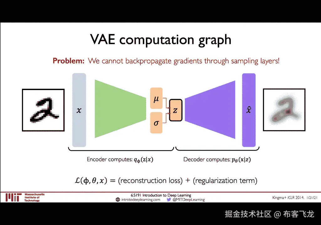 从输入到编码再到解码重建,但是我们仍然缺少将整个画面放在一起的关键步骤,这就是向后传播,这里的关键是因为这个事实,引入了这种随机采样层之后,我们现在遇到了一个问题,即我们无法向后传播。