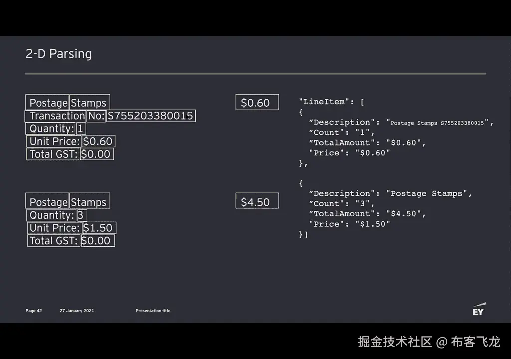 嗯,所以我们在这些文件上,在这些输入文档的左侧,右侧,我们通过ocr运行它们以获取,包含标记的边界框将输入设置为系统,然后,系统的输出是此json记录,描述我们从文档中提取的信息,正确。