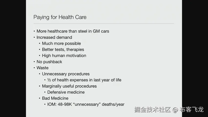 所以人类有很高的动机去做这件事,也没有太多的阻力,保险公司除外,但他们只是在保险合同中转嫁费用,也有浪费,所以有很多故事,大约一半的医疗保健,花费在某人生命的最后一年,虽然手指,他是新英格兰杂志的编辑。