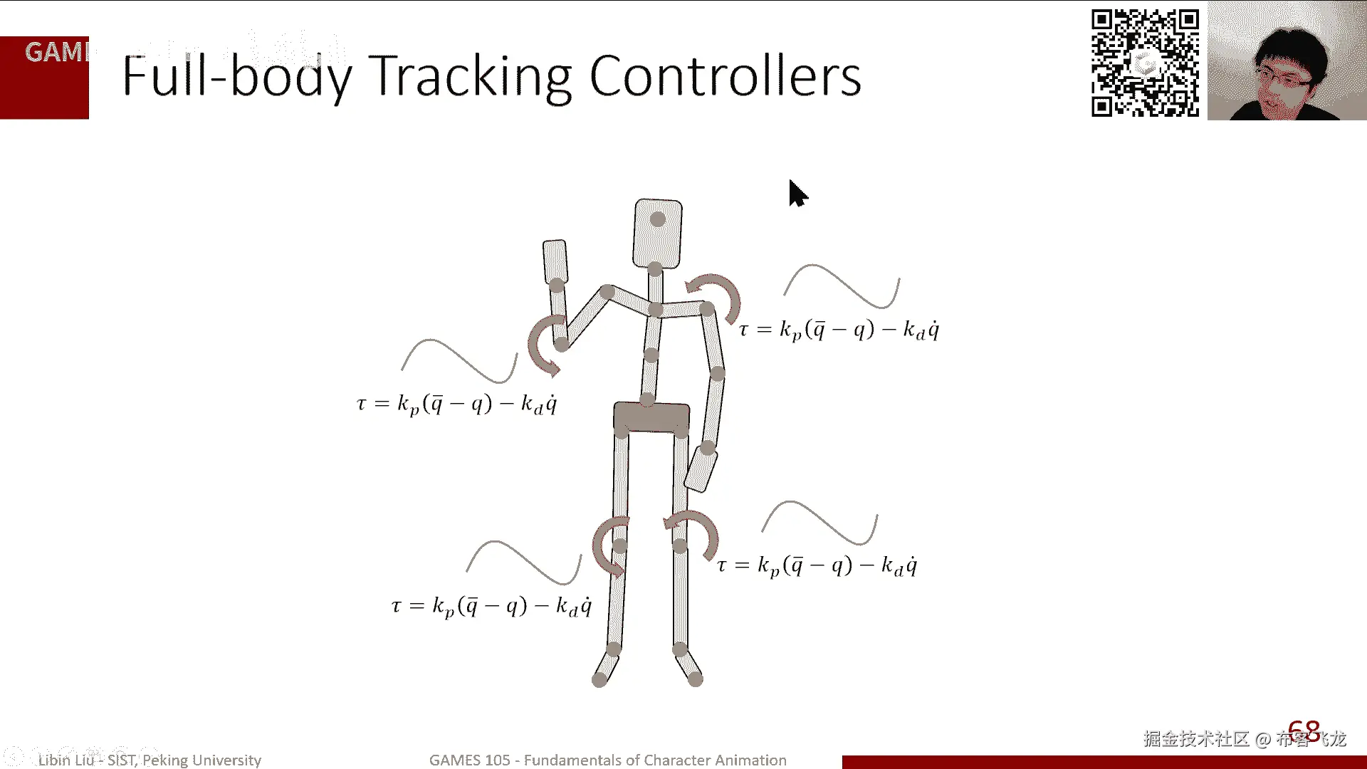 那对于一个更加这个真实的,比如一个人啊,一个一个物理仿真角色,我们通常来讲呢是通过比例微分控制啊,pd控制去计算我需要在这个角色身上加多少,每个关节上加多少的例句,那在这个过程中,实际上形式上其实就是。