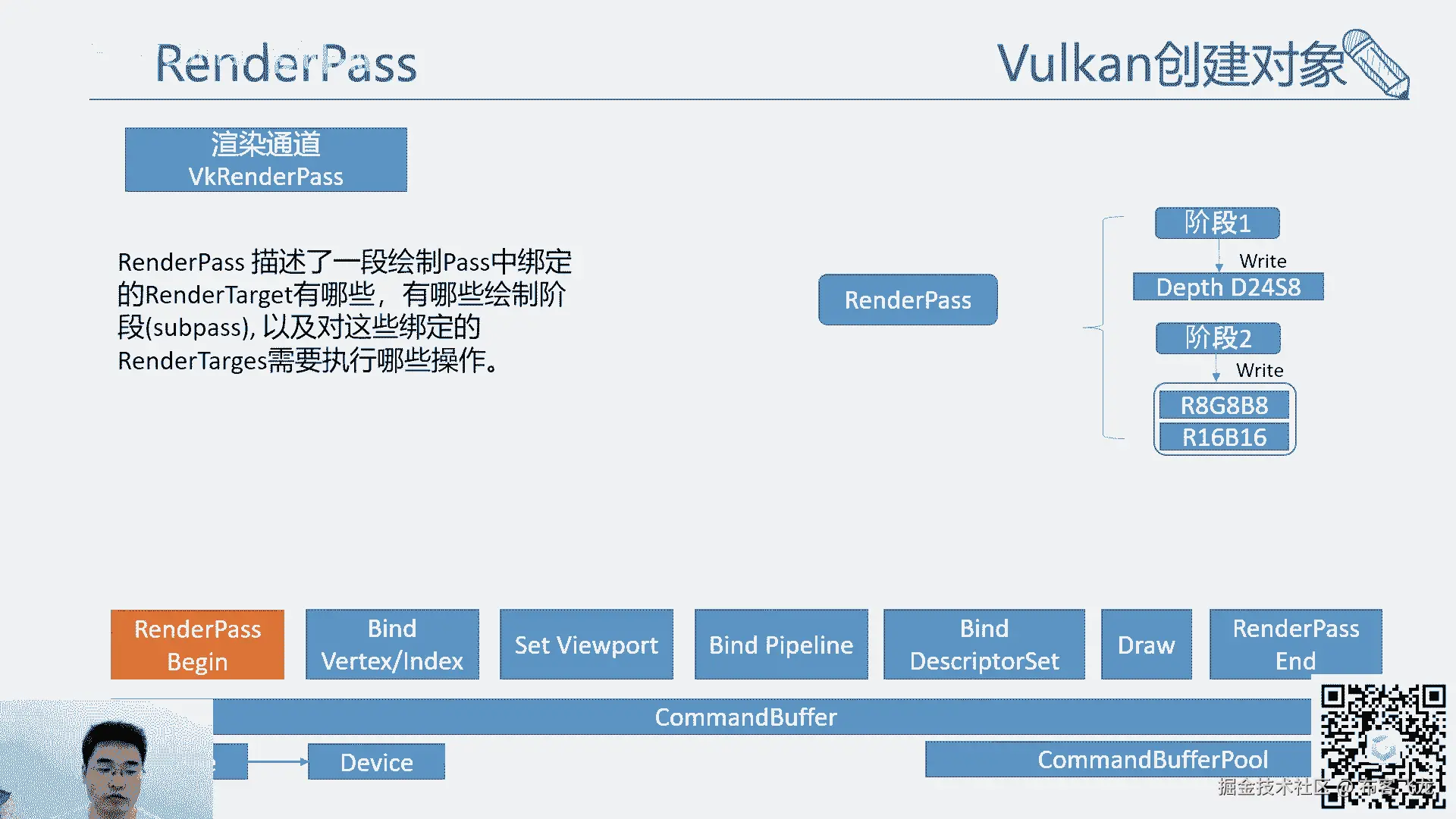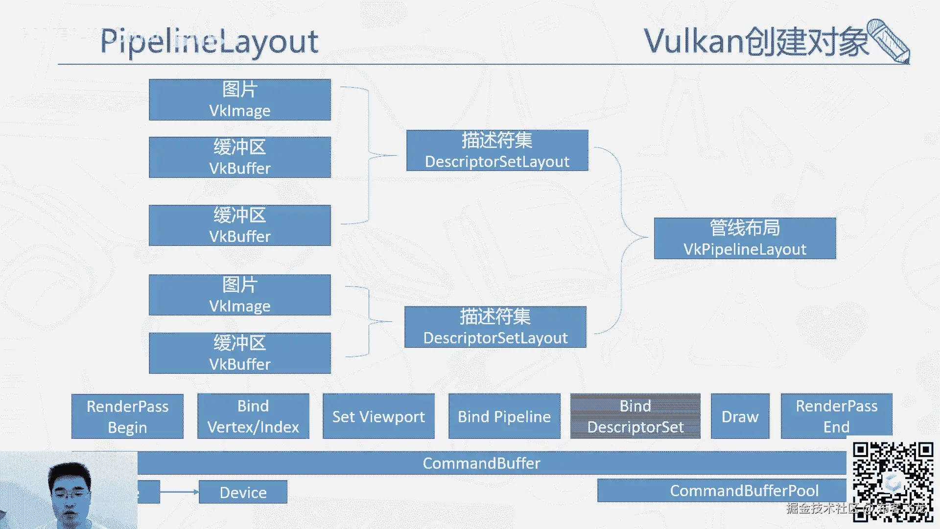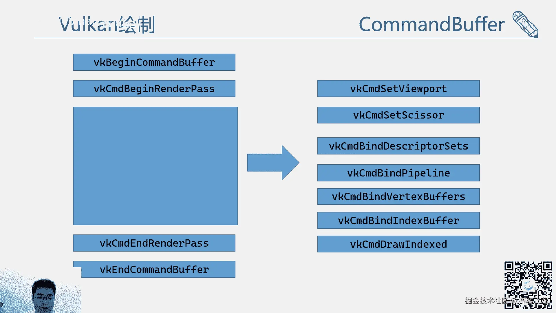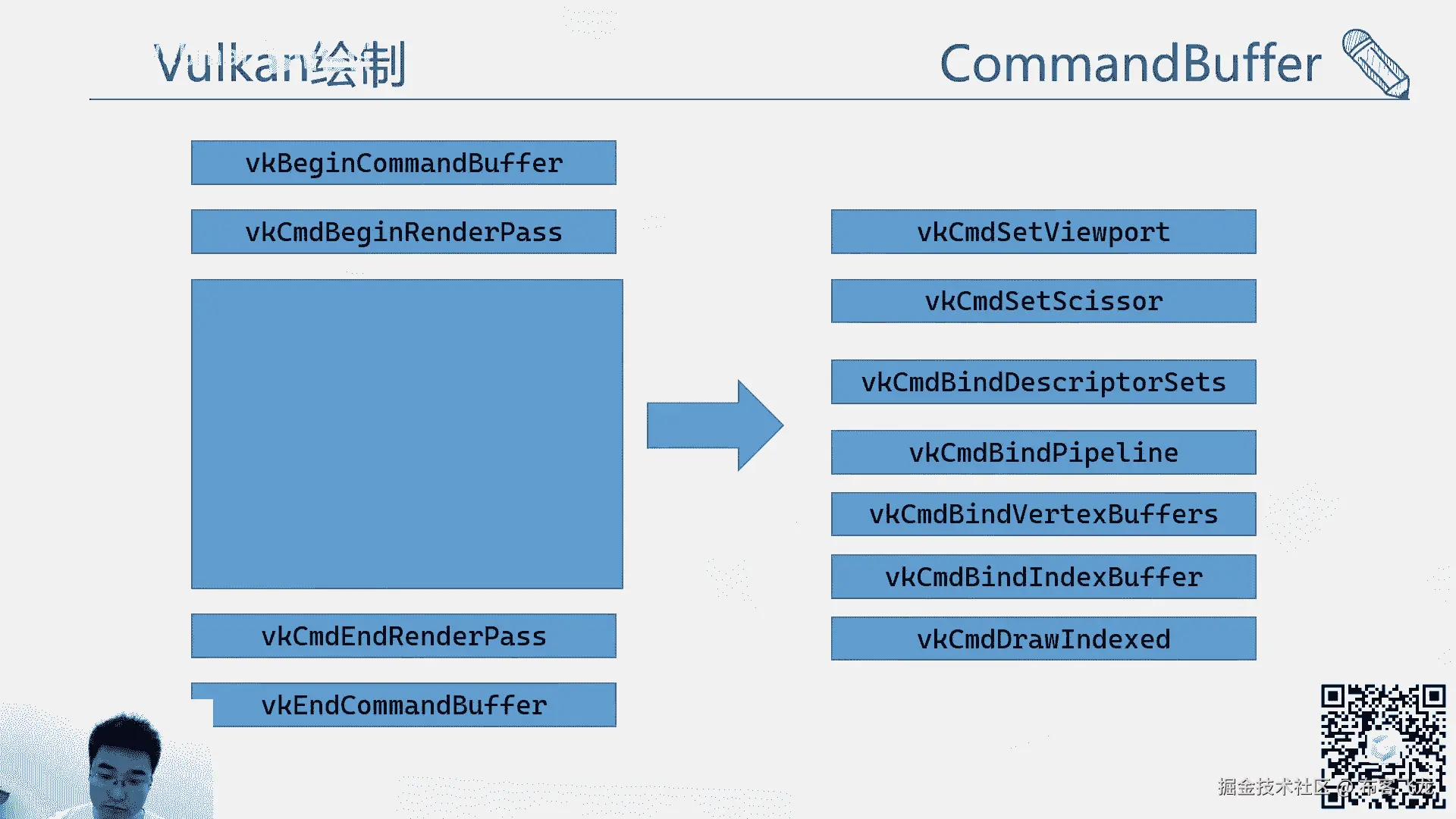 然后working的绘制,这个就我们刚才讲了,有那么多的那个流程,那么working的绘制其实大致也可以概括成这样,简单的一个是绑begin command buffer。