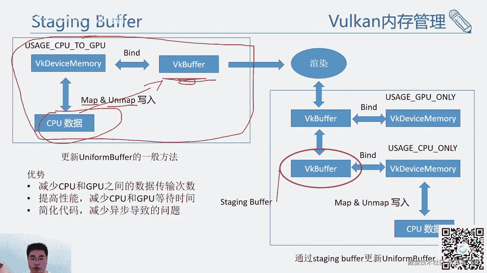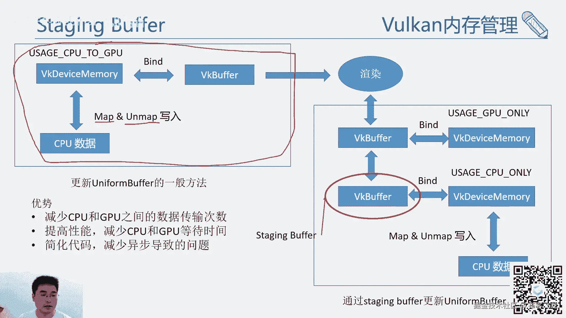 中间的那个cpu端对它的读取次数是不一样的,我们的c9 buffer,其实是直接就写回到我们的gpu那块了,然后gpu去访问它也很快,但是如果用一般的更新根据方方式呢,其实它是需要一个同步的操作的。