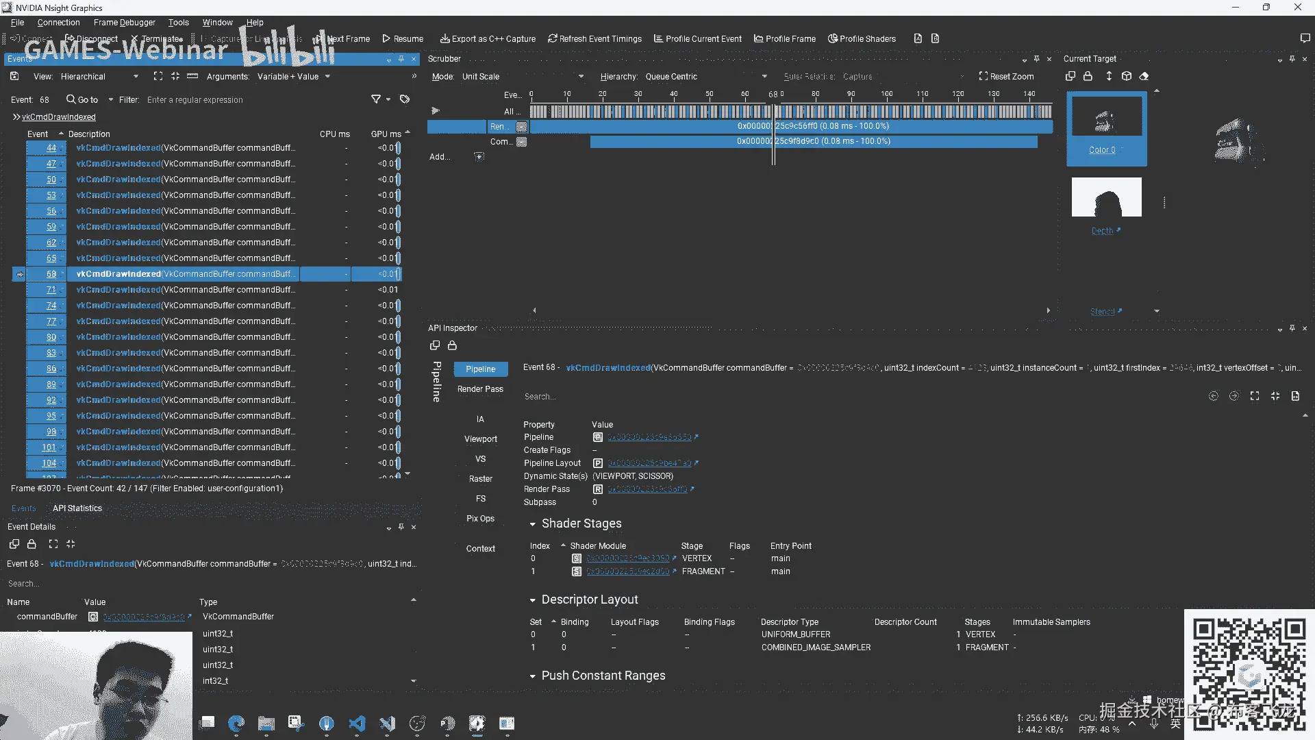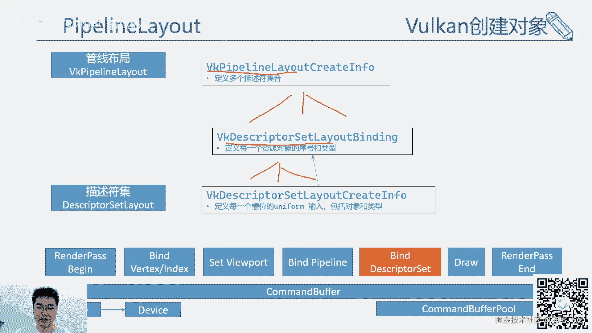 然后下面要有个end of command buffer,在做作用域里面,我们可以设置你的那个视图,一些裁剪空间什么之类的,然后绑定的set,就是绑定你的uniform的那个描述符。