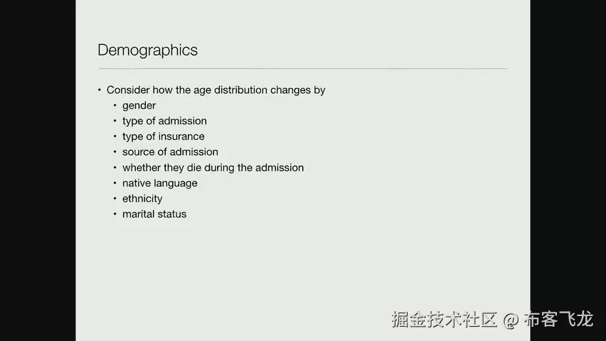 所有这些东西都在数据库里,例如,数据库里的二号病人,一九三八年七月十七日,这是去身份识别过程的一部分,很难弄清楚病人到底是谁,所以这里有几个有趣的事情需要注意,一个是有些东西有价值,有些东西没有价值。