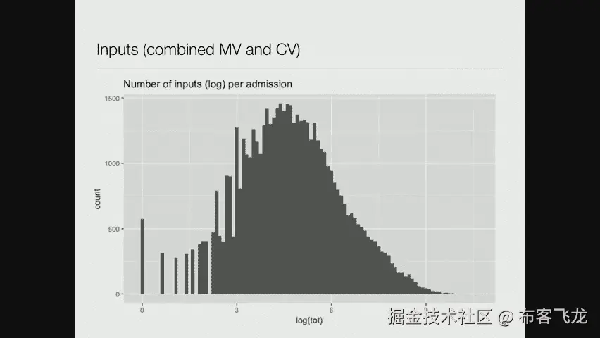 如果你看看每次入院的实验室测试,你可以做一个日志转换,得到一个看起来更合理的分布,顺便说一句,这是一个非常普遍的教训,当我们要对这些数据进行分析时,是不是经常做某种转换,就像在这种情况下。