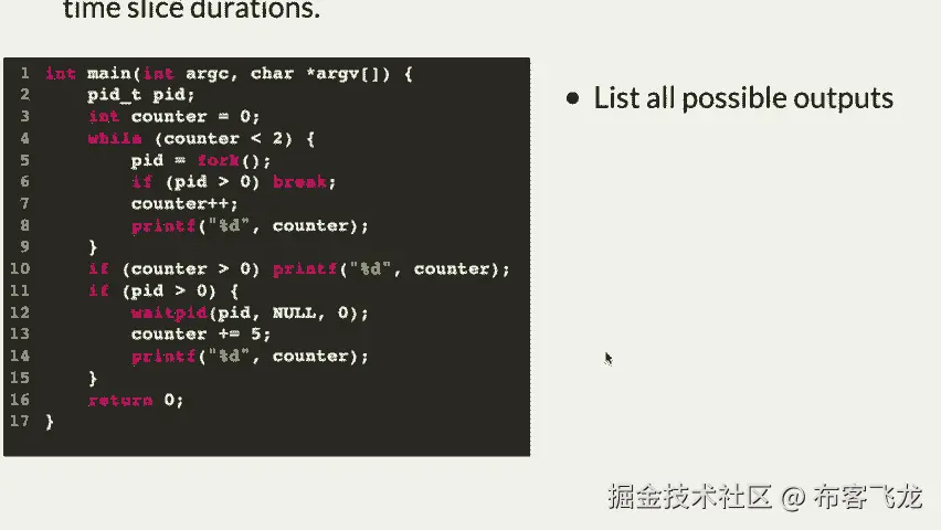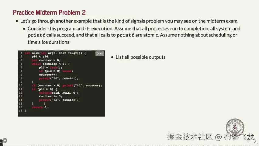 That's a pattern here。 Right。 Assume that each call flushes to output to the console and full that basically means that it's atomic and further assume that none of the system calls fail same sort thing before fork doesn't fail wait PID only returns negative one because there are no child processes at the moment that it。