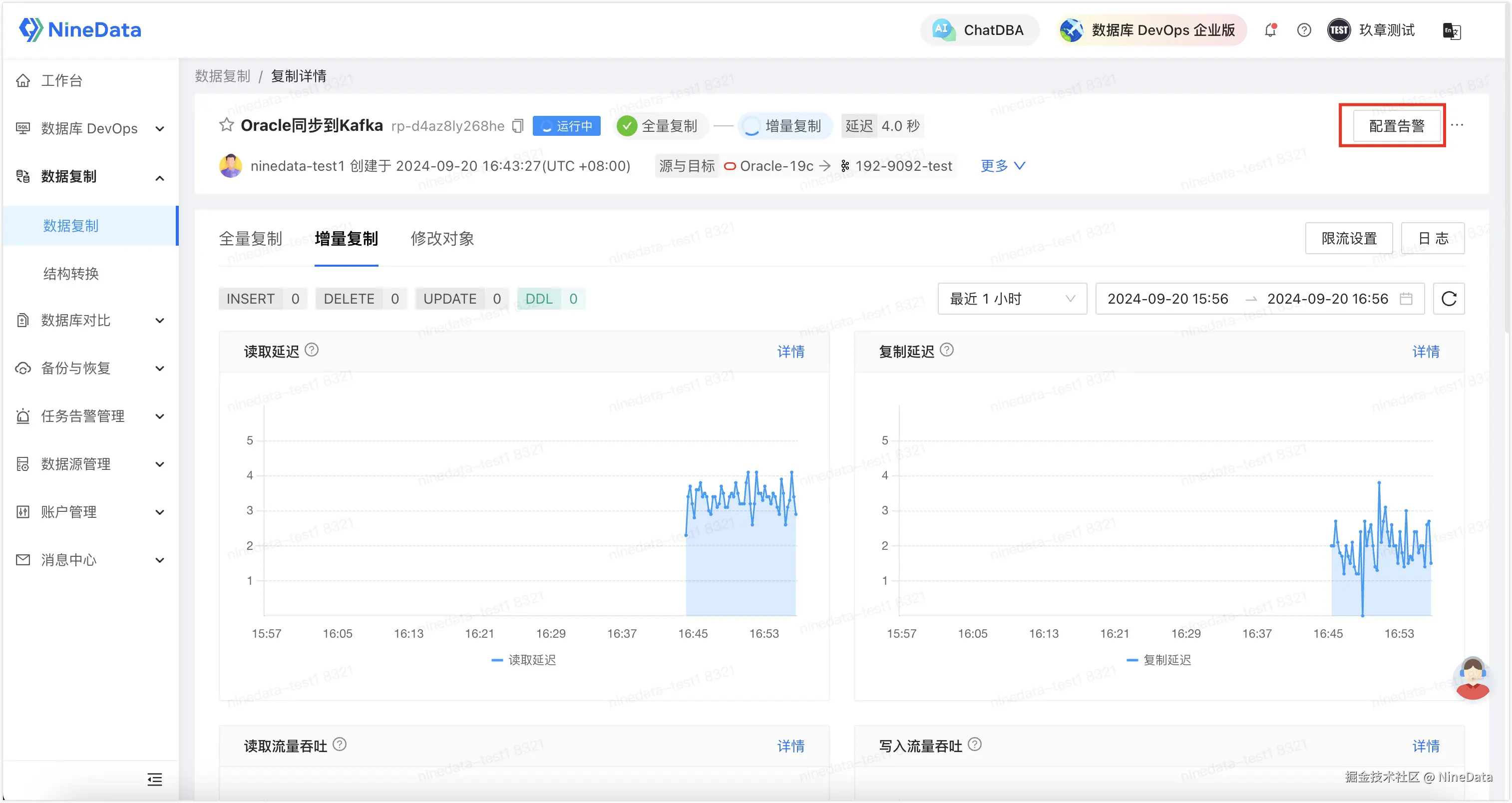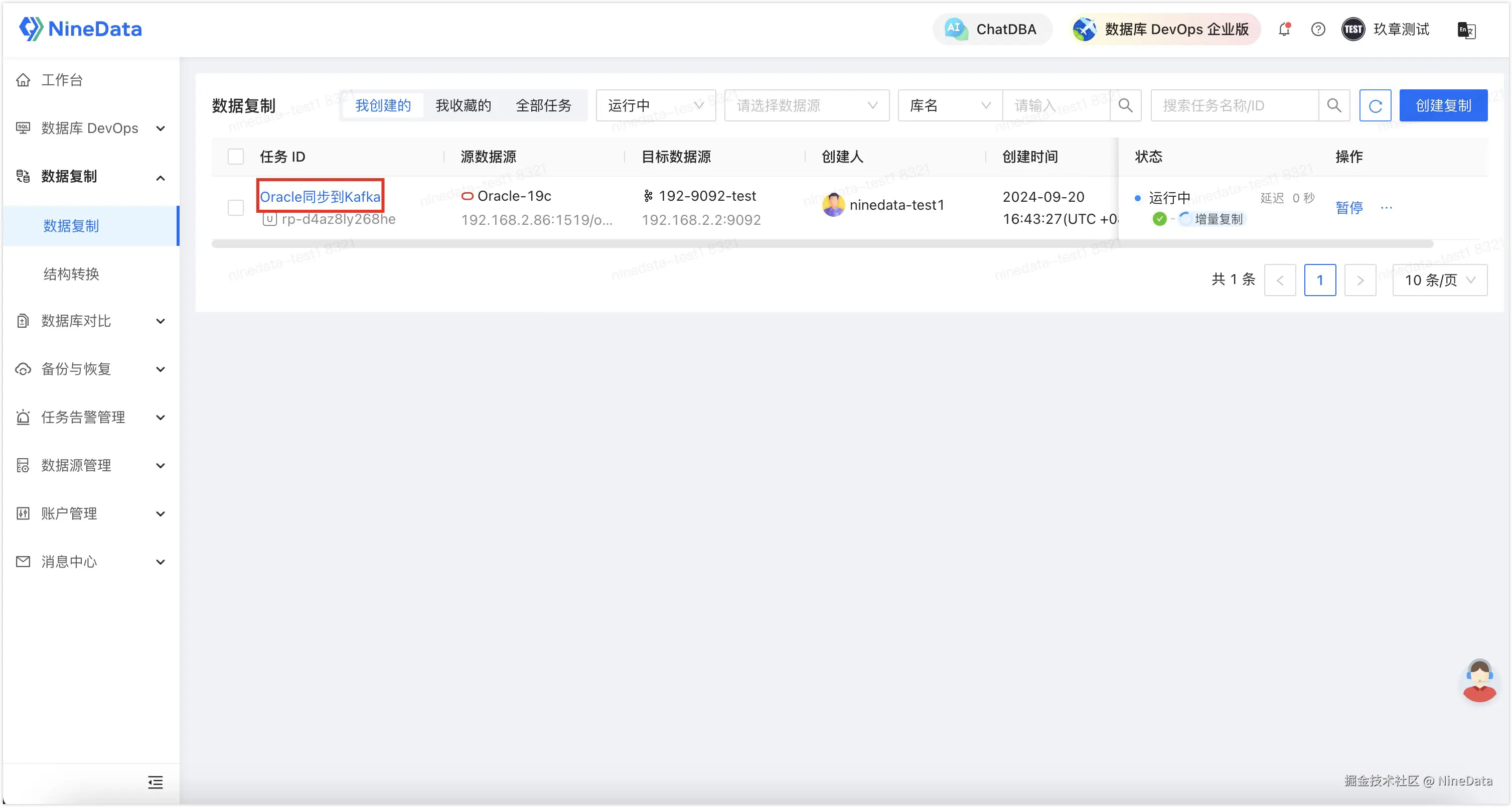 - 配置完成后启动任务,针对您配置的所有同步对象,NineData 会先对所有的存量数据进行全量迁移,接下来就是实时迁移源端 Oracle 中新增的增量数据,所有新写入的数据都将一条不漏地传递到 Kafka,每当 Oracle 端的增量数据已经全部写入 Kafka,并且没有新的增量数据时,任务面板中的延迟将显示为 0 秒,代表当前 Kafka 中的数据是最新的。