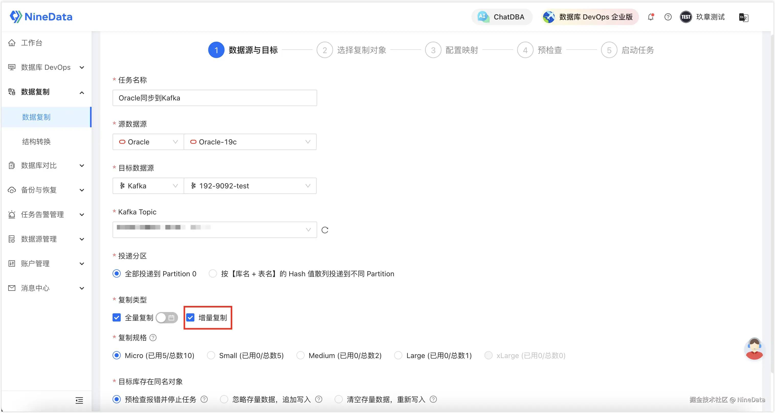 相信各位看官们都知道 NineData 是什么,此处不再赘述,在本文的场景中,NineData 是一个实时数据管道的角色,通过它可以轻松将各种业务系统(例如 MySQL、Oracle)接入 Kafka,摇身一变成为 Kafka 的生产者。