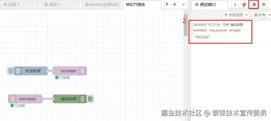 消息发布成功后,node-red 将从 MQTT 服务器接收到对应消息。