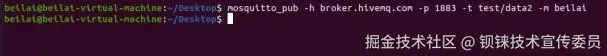 Host# mosquitto_pub -h broker.hivemq.com -p 1883 -t test/data2 -m beilai