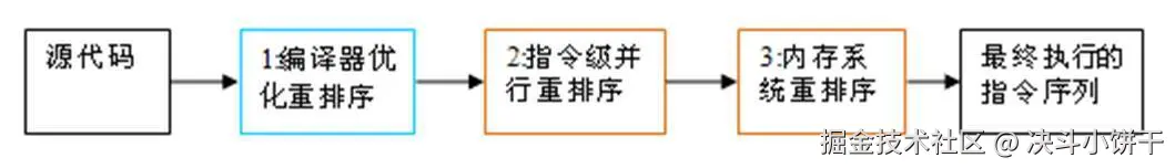 从 java 源代码到最终实际执行的指令序列,会分别经历下面三种重排序: