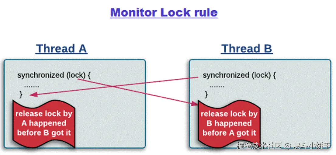 - 另外还有两个与锁相关的操作,Lock与unlock,比如说加了synchronized,才会产生有lock与unlock操作;如果对共享变量的操作没有加锁,那么也就不会有lock与unlock操作。