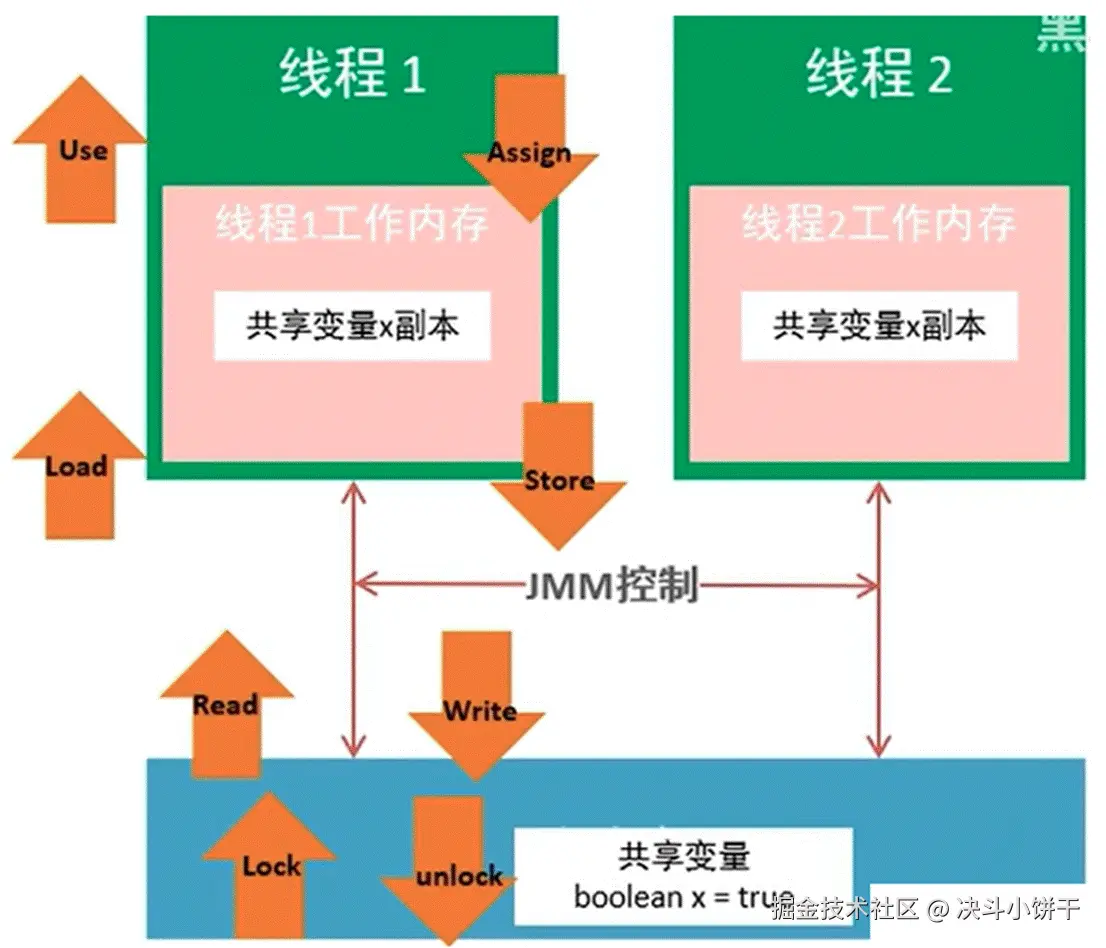 举个例子:假设现在线程1想要来访问主内存当中的共享变量 x ,即当前主内存中的共享变量x的取值为 boolean x = true;