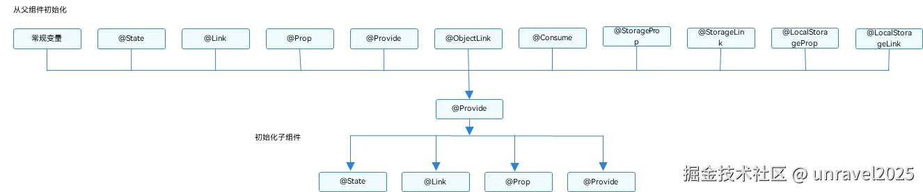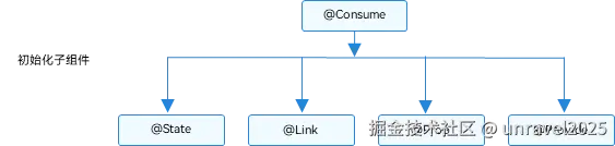 @Consume,@Provide建立关联的关系和@Link与 @State建立关联的方式非常类似。只不过@Link与@State是直接传递,@Consume与@Provide是逐层向上查找。