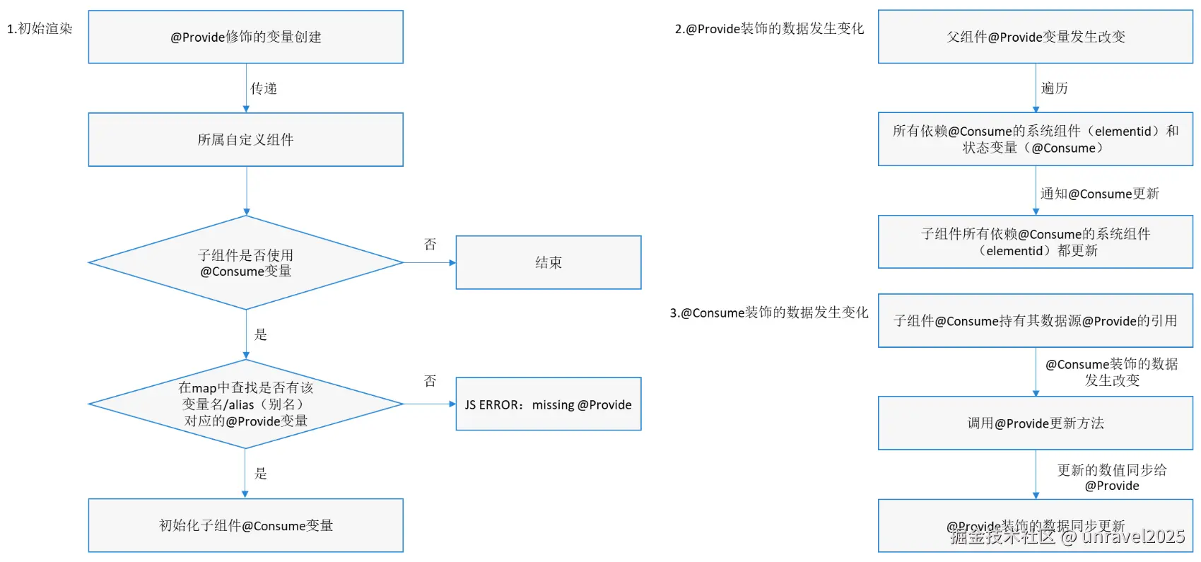 - 通知@Consume更新后,子组件所有依赖@Consume的系统组件(elementId)都会被通知更新。以此实现@Provide对@Consume状态数据同步。