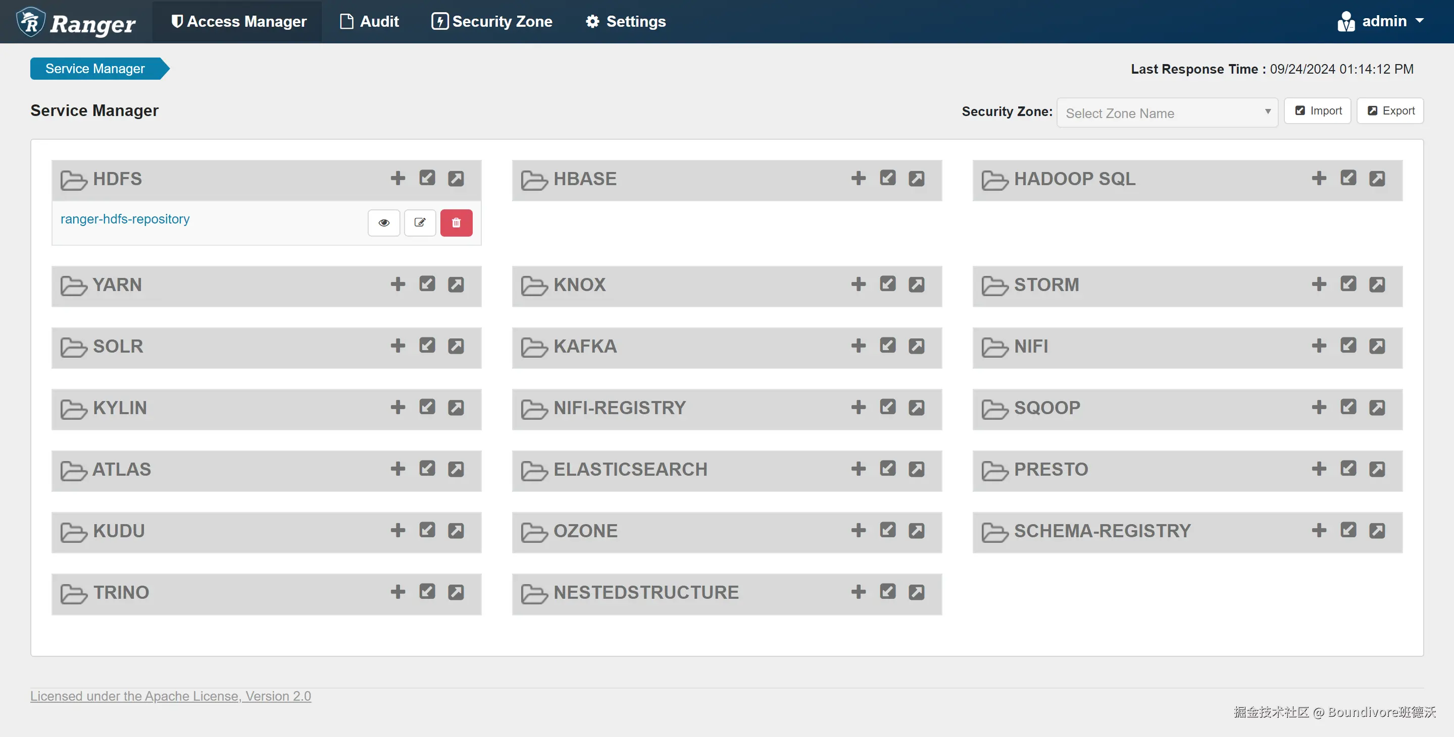 - 支持 RangerAdmin、RangerUserSync、RangerTagSync 的部署与管理,实现集中的权限控制和安全审计。