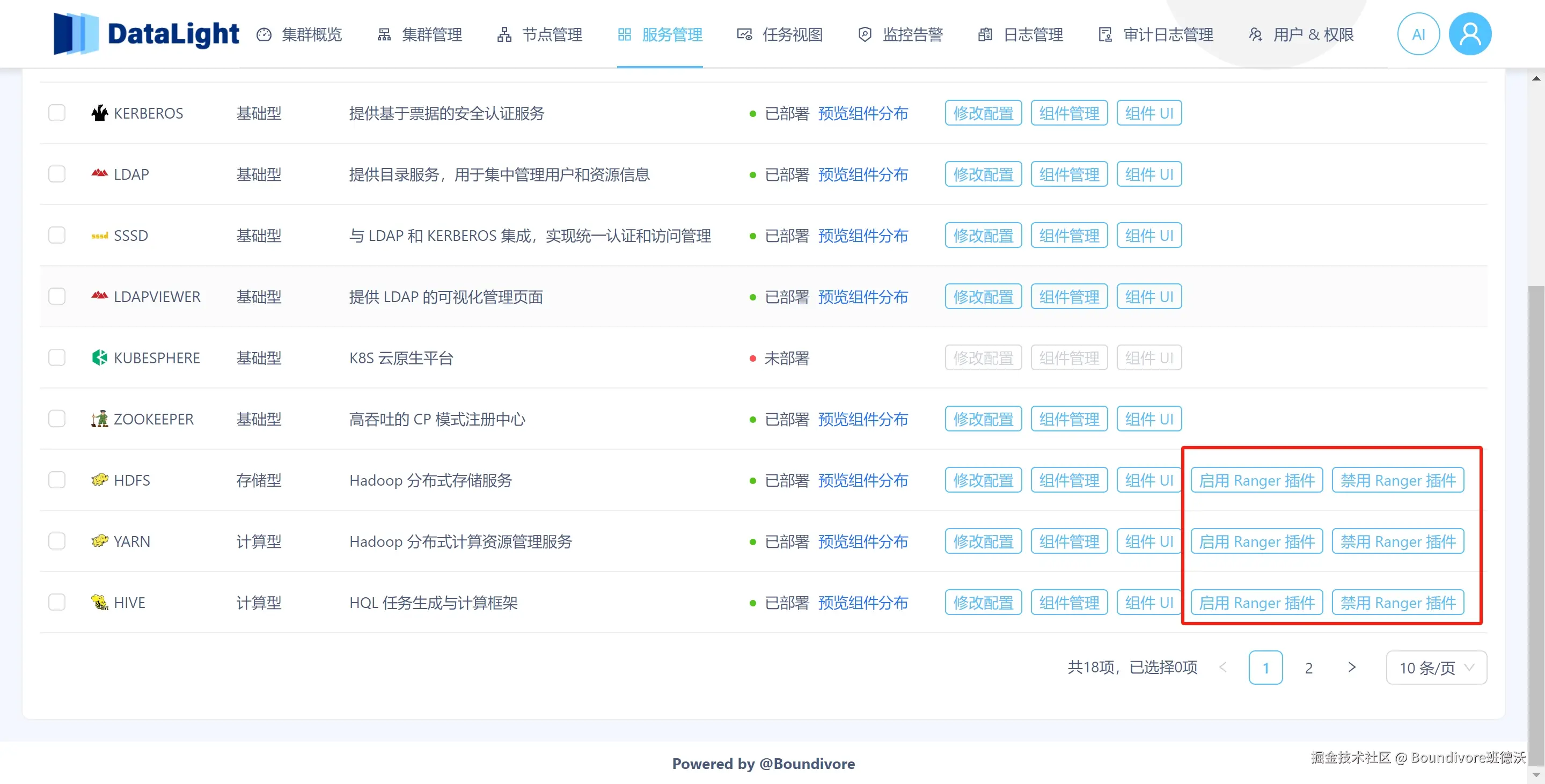 在 DataLight 平台上,可以一键启用或禁用各服务的 Ranger 插件,灵活控制权限管理功能。