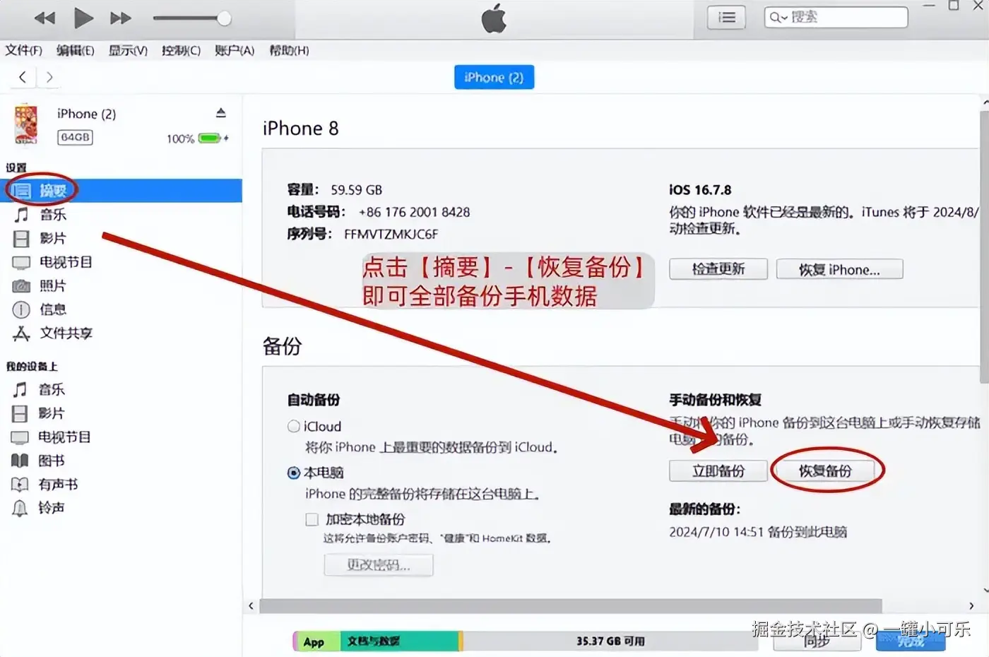 视频彻底删除还能恢复吗?iTunes软件也能恢复手机丢失的数据,但要注意的是iTunes备份的是整个手机的数据,备份的过程中会覆盖以往的手机数据哦。