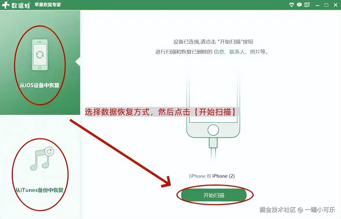 步骤1:使用数据线将你的苹果设备连接到电脑。软件识别到设备后,选择 【从iPhone恢复】或【从iTunes恢复】模式,并点击【开始扫描】 ,软件将开始深度扫描你的设备数据。