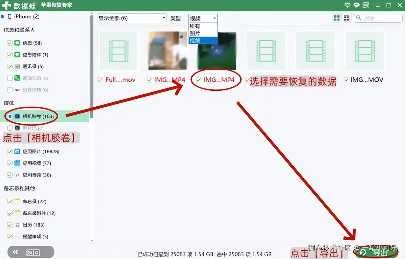 步骤2:扫描完成后,在软件界面中找到并点击 【相机胶卷】 选项,这里将展示所有扫描出的照片和视频。通过滚动鼠标,预览并找到你想要恢复的视频,勾选它们,然后点击 【导出】 按钮,这些视频就会重新回到你的设备中。