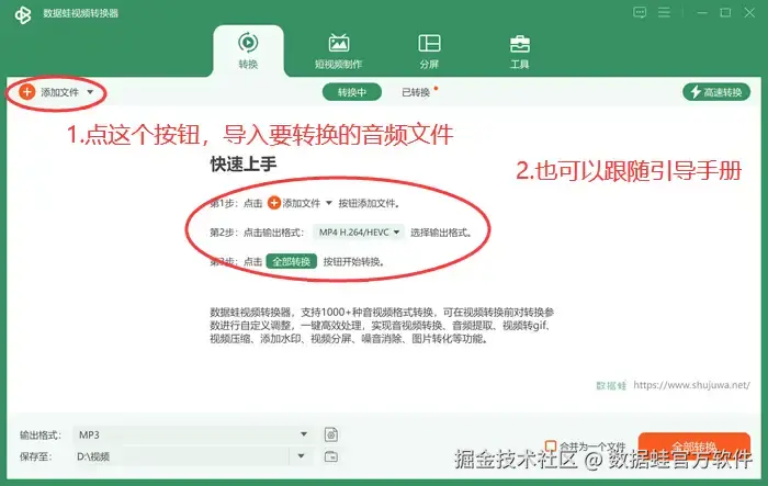 除了音频转码外,数据 蛙视频转换器还支持视频转码、音视频剪辑等丰富功能。它支持多种主流和非主流的格式,包括但不限于FLAC、MP3、WAV、MKV、AVI等格式。堪称是万能格式转换器免费版。它贴心提供了试用功能,且功能强大,一次性可以批量导入和转码音频文件。最重要的是,该软件在转换过程中能保留原始音频的音质,从而减少音质损失。