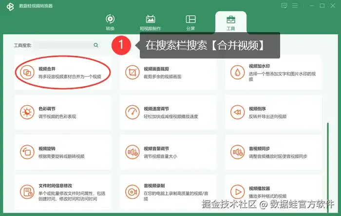 第一步: 打开数据 蛙视频转换器,点击界面上方的 【工具】 选项,然后找到并单击 【视频合并】 。