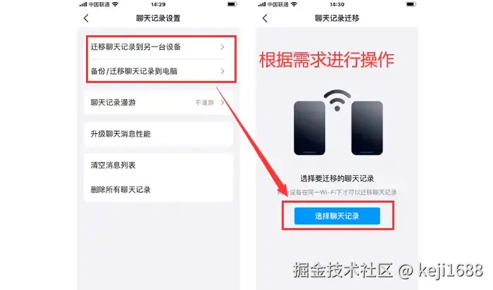 步骤2:在【聊天记录设置】页面中,你可以选择迁移或备份聊天记录,然后【选择聊天记录】进行备份恢复即可。