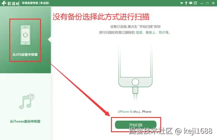 步骤1:手机成功连接至电脑上后,打开苹果恢复专家选择【从iOS设备中恢复】并点击【开始扫描】 。