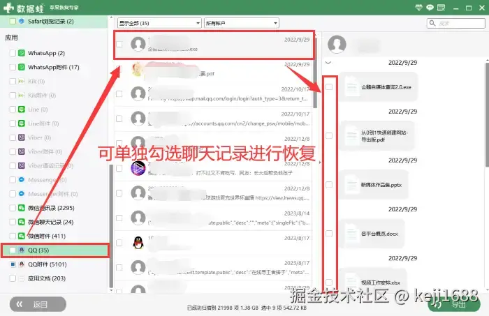 步骤2:等待软件扫描并分析苹果手机中的QQ数据内容,点击恢复目录中的【QQ】可以将QQ聊天记录全部恢复,也可以勾选特定联系人恢复聊天记录。最后点击【导出】按钮就能将手机里的QQ聊天记录恢复到电脑上了。