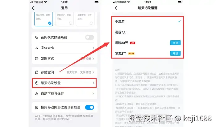 步骤1:根据方法一的操作,进入QQ的【通用】页面里,选择【聊天记录设置】并开启漫游聊天记录功能,选择合适的漫游天数。
