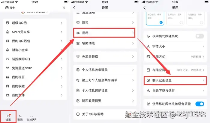 步骤1:登录QQ,在QQ面板的底部,找到并点击【设置】选项。点击【通用】并找到【聊天记录设置】进入。
