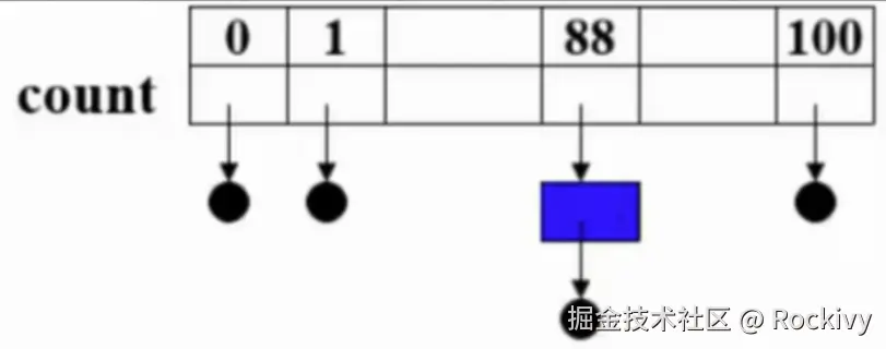 count是数组,这个数组的每一个元素都是一个指针,一开始被初始化为空链表的头指针,所以一开始有101个空链表(对应了101个空的桶 )