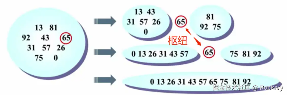 快速排序采用分而治之的策略,与归并排序相似。其核心在于选择一个主元(pivot)作为分割点。