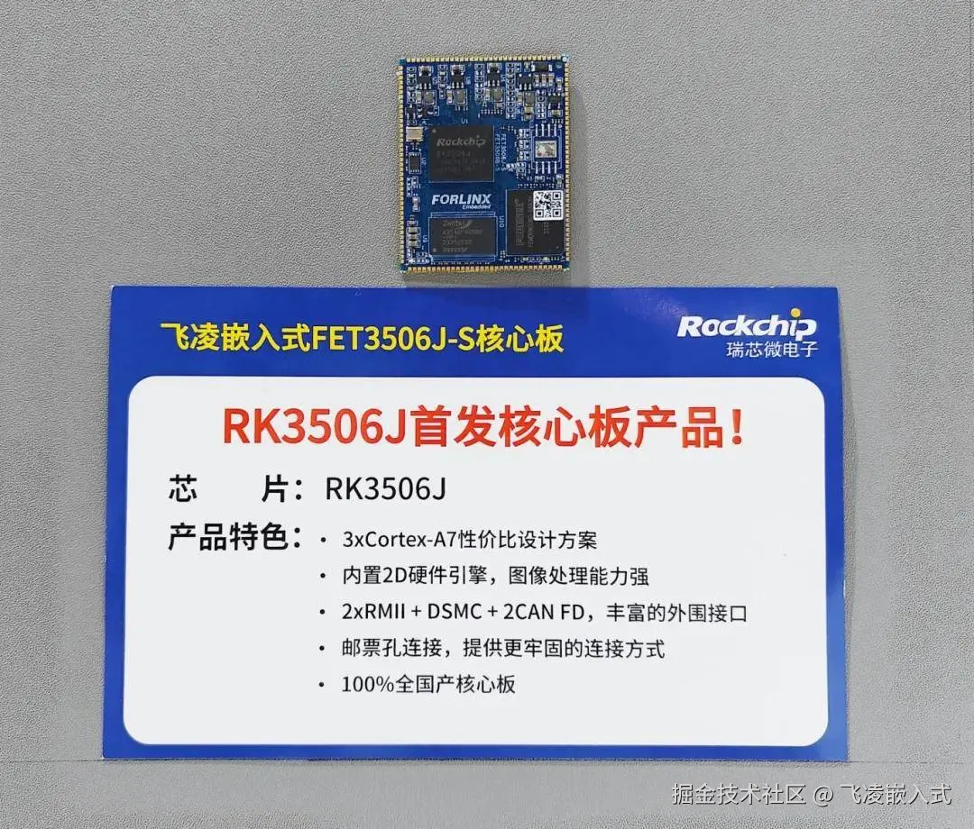 本届工博会上,瑞芯微电子发布了全新的RK3506系列高性能处理器,同时,飞凌嵌入式FET3506J-S核心板作为业内首个SoM方案一同亮相。飞凌嵌入式FET3506J-S核心板采用3核Cortex-A7架构,超频可达1.6GHz,专为智能语音交互、音频输入/输出处理、图像输出处理和其他数字多媒体应用程序设计。内嵌丰富的外设接口,如I2S、PCM、TDM、PDM、SPDIF、Audio DSM、Audio、ADC、RMII、CAN等,可以满足不同领域的应用开发,减少硬件开发的复杂性和开发成本。