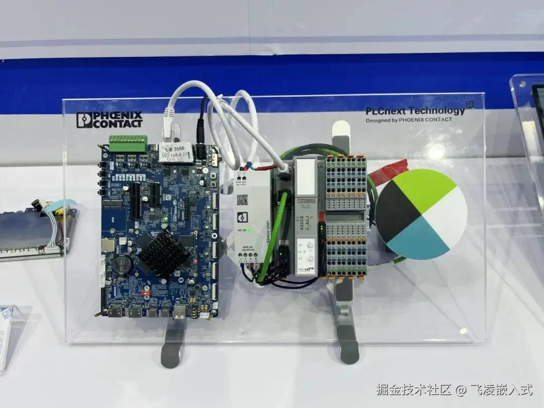 此外,飞凌嵌入式展位还展示了合作伙伴的演示方案,如RT-Thread带来的“基于OK3568-C开发板的RT-Thread混合部署解决方案”和菲尼克斯电气带来的“基于OK3588-C开发板的PLC主站和从站通讯演示方案”,生动的演示不仅吸引了现场观众的驻足观看,更充分展现出飞凌嵌入式在生态联合方面开放、积极的姿态。