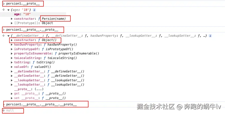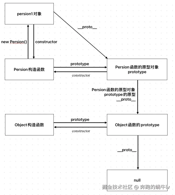 通过图中我们可以看到,我们首先通过__proto__数学查看persion1对象的原型,可以看到是来自Persion。接着打印persion1对象的原型对象的原型persion1.proto.proto,可以看到是来自于Object,然后再打印最后一层得到的结果是null。我们通过一张图来描述一下这个关系: