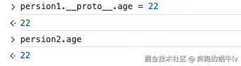 通过图中可以看到,我们通过persion1对象改变了原型中的age的值,再通过persion2对象打印age的值也变成了22,这说明确实persion1和persion2的原型是指向了通一个对象。