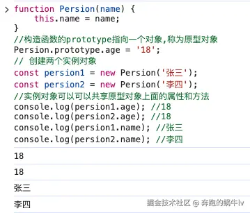 上面代码中,我们给构造函数Persion的prototype设置了一个age属性并赋值18,然后创建了两个对象persion1和persion2。通过打印访问age,实例对象都访问到了该属性。然后再看下面的图片:
