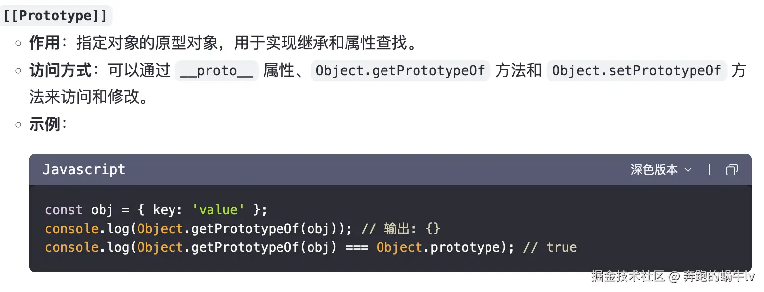 在JavaScript中,每个对象都有一个[[Prototype]] 属性,它是一个内部属性(在JavaScript中,内部属性是指那些由JavaScript引擎内部使用的属性,它们不直接暴露给开发者,但对语言的运行机制起着重要作用。这些内部属性通常以双方括号([[...]])表示,以区分普通的对象属性),[[Prototype]] 属性用于实现对象之间的继承关系。