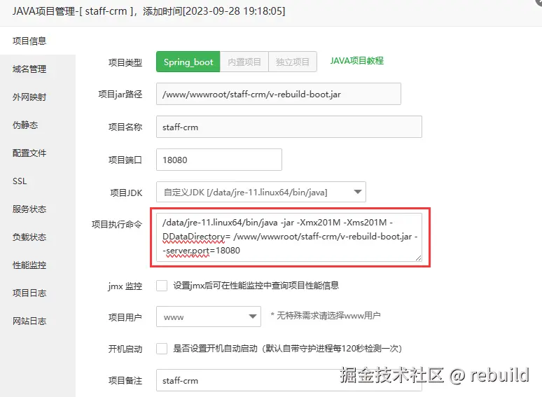 /data/jre-11.linux64/bin/java -jar -Xmx201M -Xms201M -DDataDirectory= /www/wwwroot/staff-crm/v-rebuild-boot.jar --server.port=18080