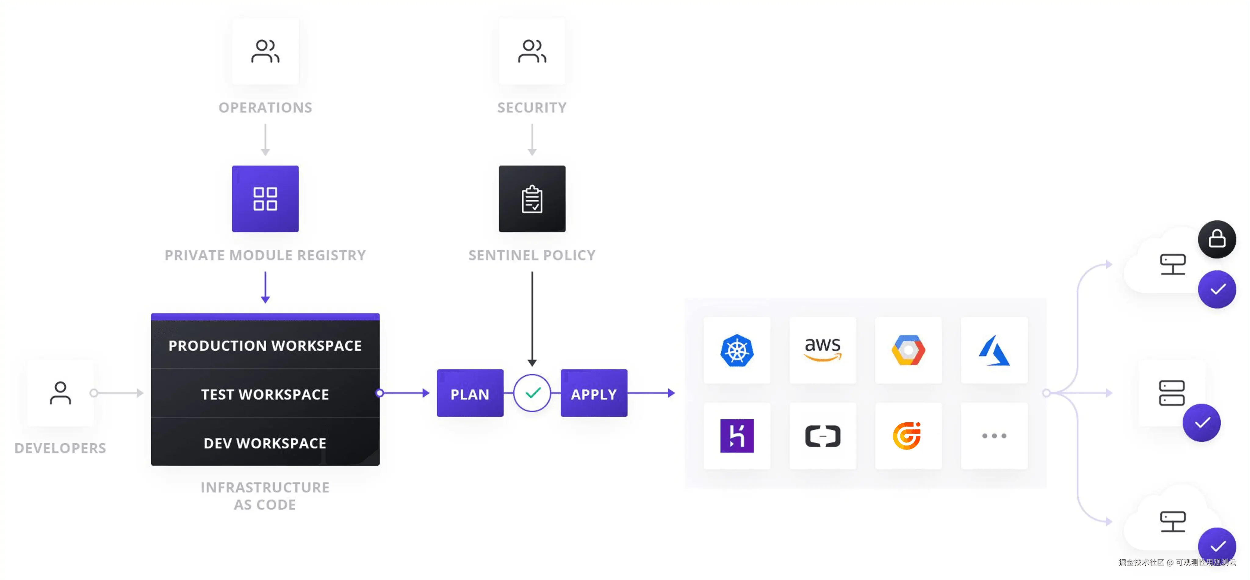 - 跨平台特性:目前海内外累计已有超过 40 家公有云厂商支持,另有 200 多个软件服务商为其提供支持。利用 Terraform 跨平台特性,可以非常方便的将观测云资源同其他厂商资源进行集成。