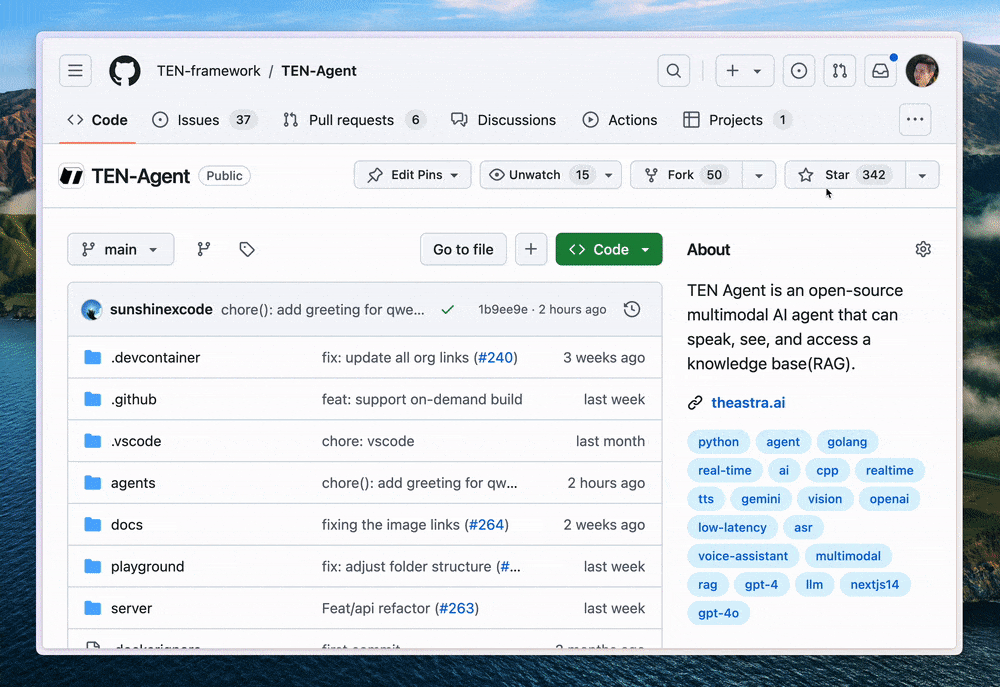 使用 TEN 作为你的 AI 智能体框架,让你的想象力起飞!立即访问 TEN Agent 仓库,构建你的第一个AI 智能体吧!如果你享受构建和探索的乐趣,记得在仓库上为我们点赞。github.com/TEN-framewo…